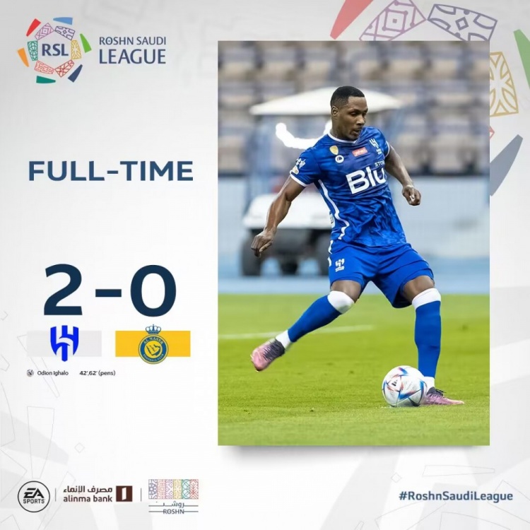 第62分钟,伊哈洛主罚依旧选择打球门右下角,门将再次判断错方向,伊哈洛完成梅开二度!利雅得新月2-0利雅得胜利↓