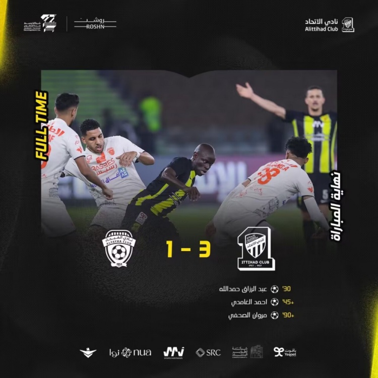 吉达联合首发:1-阿尔迈伊沃夫、37-法瓦兹、5-路易斯-费利佩、26-赫加齐、15-哈桑、27-艾哈迈德(88'29-沙姆拉尼)、16-加姆迪(74'17-萨哈菲)、7-坎特、11-若塔(87'77-阿姆里)、99-哈姆达拉、9-本泽马(74'14-阿瓦德)