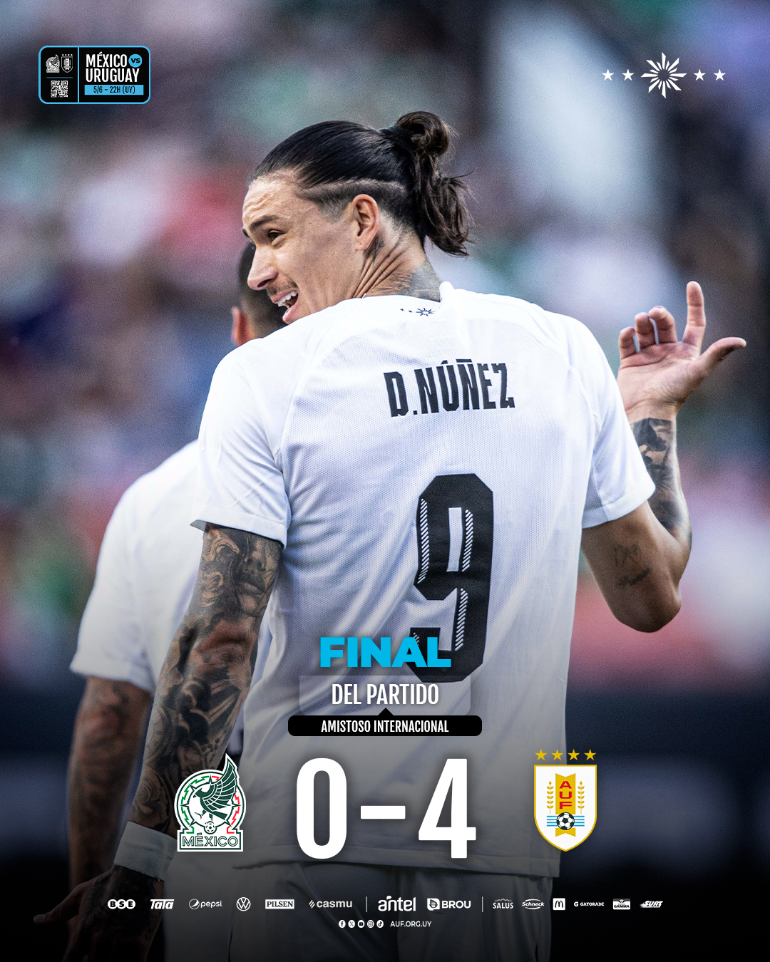 06月06日讯 热身赛墨西哥vs乌拉圭,努涅斯首发69分钟戴帽,佩利斯特里也有一球进账,乌拉圭4-0大胜。