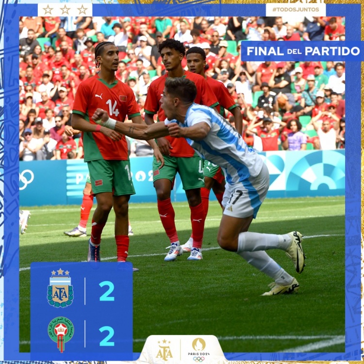 7月24日讯 北京时间7月24日晚21时整,2024年巴黎奥运男足小组赛B组第1轮展开角逐,阿根廷U23对阵摩洛哥U23。上半场拉希米打破僵局,下半场索莱尔推人送点,拉希米点射梅开二度,西蒙尼三儿子朱利亚诺-西蒙尼替补扳回一城,阿尔瓦雷斯失单刀,超长补时中梅迪纳第106分钟绝平。最终阿根廷连追两球2-2战平摩洛哥,阿根廷国奥绝处逢生收获1分。阿根廷下轮将对阵伊拉克,摩洛哥将迎战乌克兰。