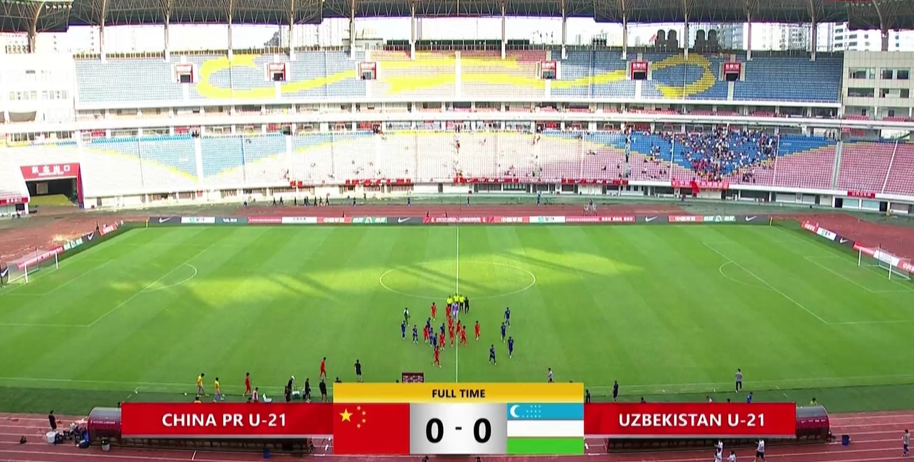 全场比赛结束,中国U21队0-0战平乌兹别克斯坦U21队。