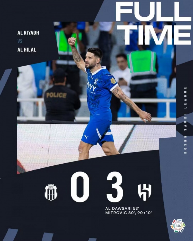 利雅得新月首发:37-布努、20-坎塞洛(79'16-纳塞尔-多萨里)、3-库利巴利(89'28-穆罕默德-卡努)、5-布莱希、12-沙赫拉尼、8-鲁本-内维斯、22-米林科维奇(87'87-坦巴蒂)、29-萨勒姆-多萨里、77-马尔科姆(71'88-哈马德-亚米)、11-莱昂纳多(79'15-卡塔尼)、9-米特洛维奇