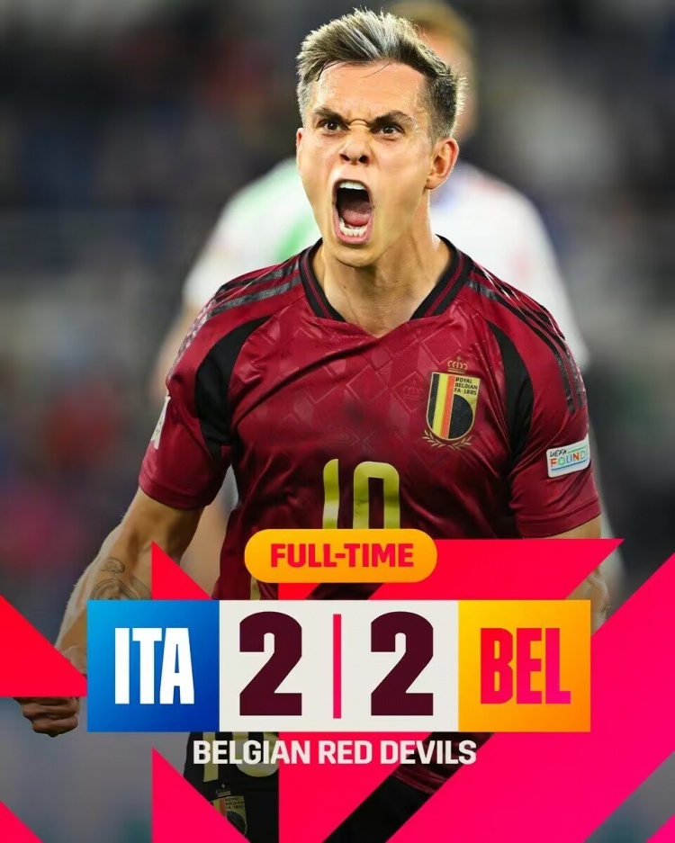 欧国联-十人意大利2-2比利时 佩剑染红坎比亚索造2球特罗萨德破门