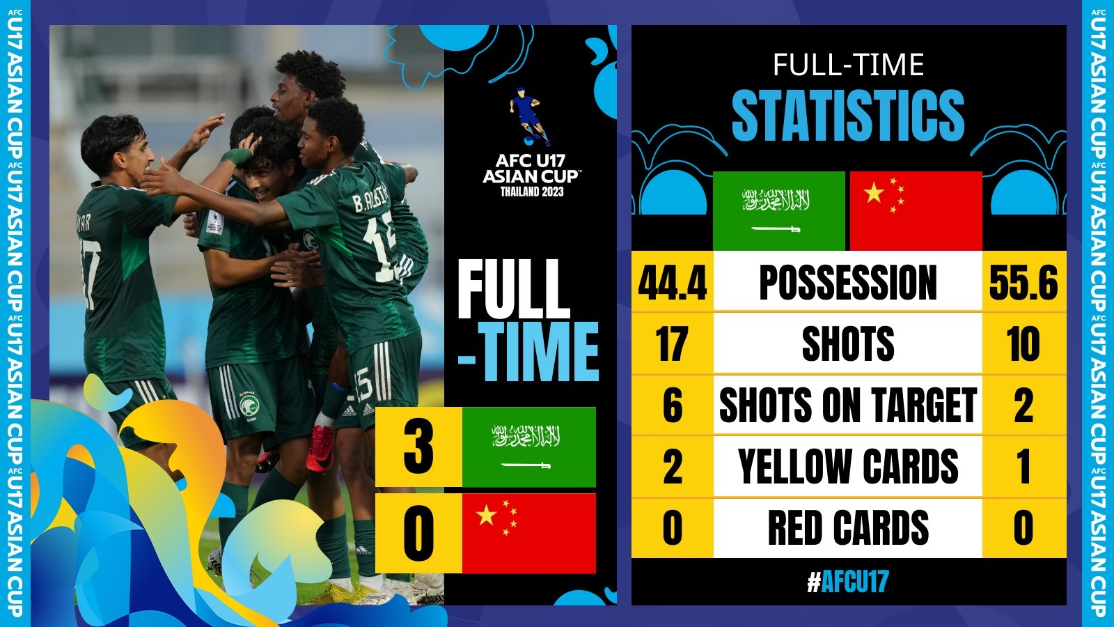 第90+2分钟,沙特队前场围攻禁区内连续打门,中国队解围失误,阿马尔凌空抽射破门!U17中国队0-3沙特阿拉伯U17↓