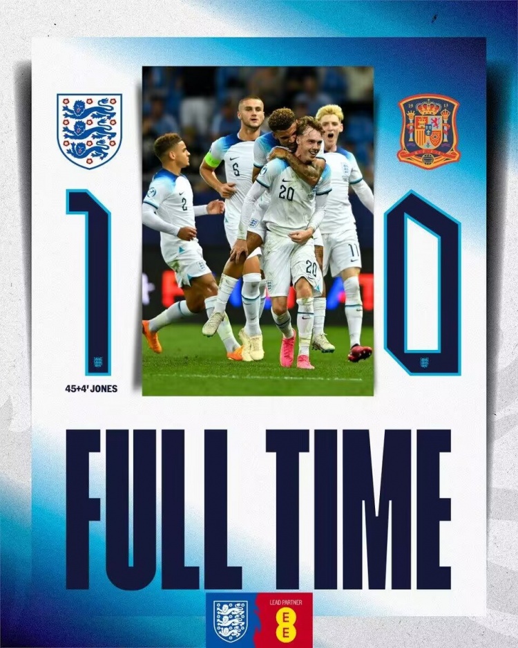 第47分钟,英格兰打破僵局!右路定位球机会,帕尔默直接打门打在柯蒂斯-琼斯上反弹破门,英格兰国青1-0西班牙国青。↓