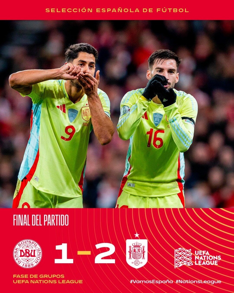 11月16日讯 欧国联A4组第5轮,西班牙客战丹麦。上半场,阿约泽中框,奥亚萨瓦尔首开纪录。易边再战,阿约泽建功本场传射,法比安回传失误送大礼,伊萨克森笑纳空门。最终西班牙2-1客胜丹麦。积分榜方面,西班牙6分领跑锁定头名。