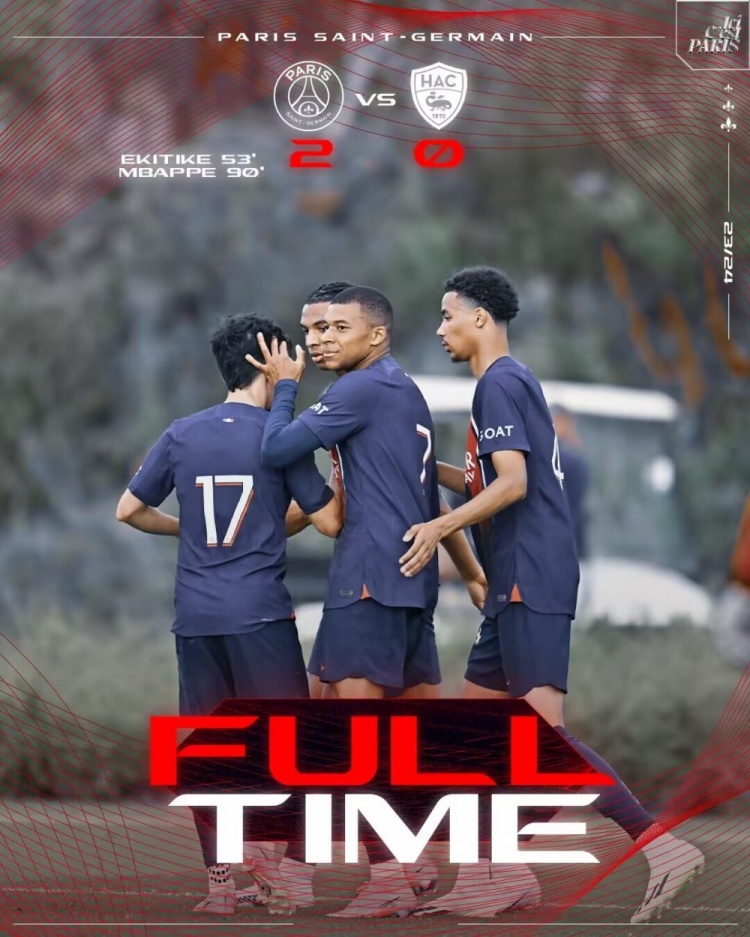 7月21日讯 北京时间7月21日23时,巴黎圣日耳曼与勒阿弗尔进行一场友谊赛。上半场双方均无建树,李刚仁受伤下场。巴黎半场0-0战平勒阿弗尔。下半场,替补登场的埃基蒂克首开纪录,姆巴佩补时建功。最终巴黎2-0击败勒阿弗尔。