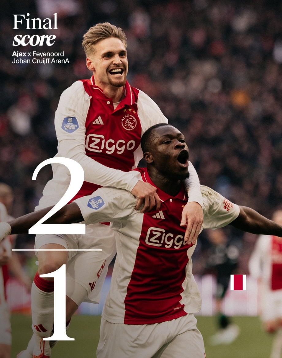 5连胜!阿贾克斯2-1绝杀费耶诺德 贾府落后榜首2分飞燕4轮不胜