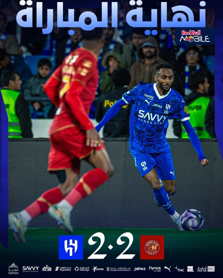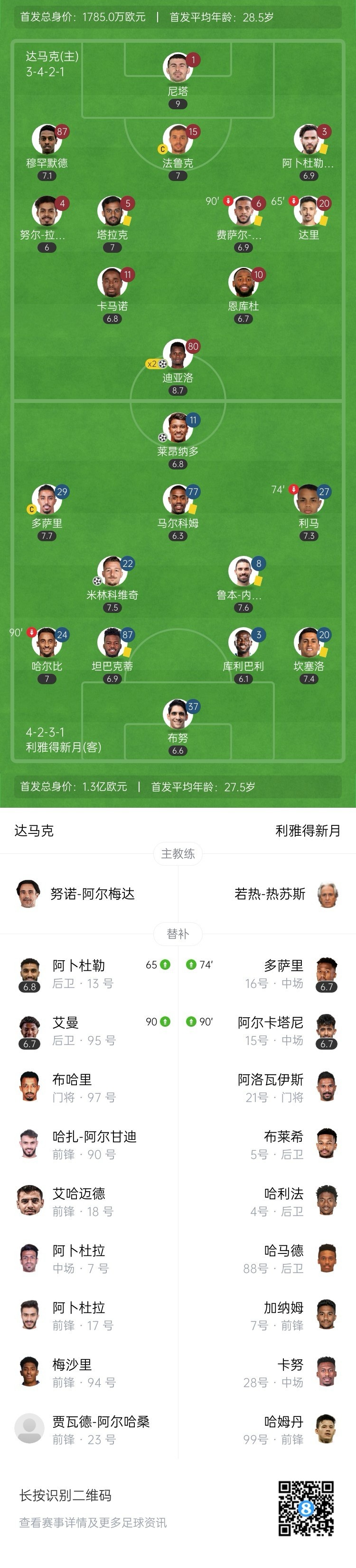 全场比赛结束,利雅得新月客场2-2战平达马克。↓