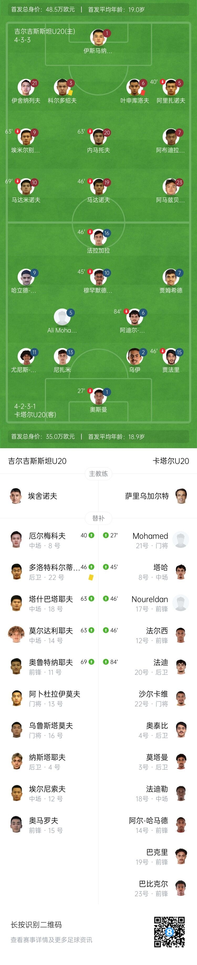 2月18日讯 北京时间2月18日晚上19:30,U20亚洲杯小组赛A组第三轮,吉尔吉斯斯坦U20对阵卡塔尔U20。上半场,贾姆希德一条龙破门,叶申库洛夫染红,塔哈补射进球。下半场,古达再下一城,诺雷尔丁锦上添花。