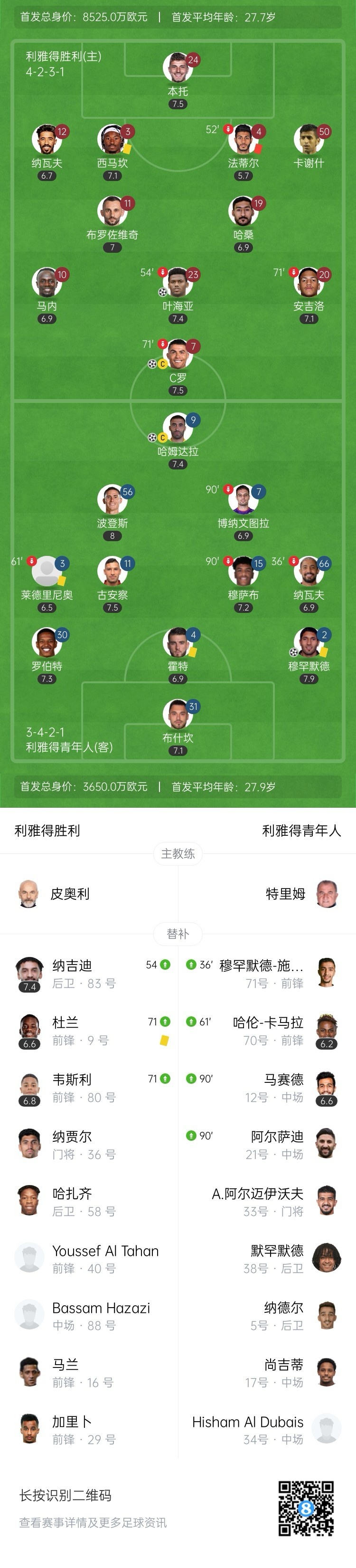 胜利3分钟扳平!叶海亚破门!第45+2分钟,C罗主罚左路任意球似传似射,防守球员解围没有踢远,叶海亚跟进凌空抽射破门,利雅得胜利1-1利雅得青年人!↓
