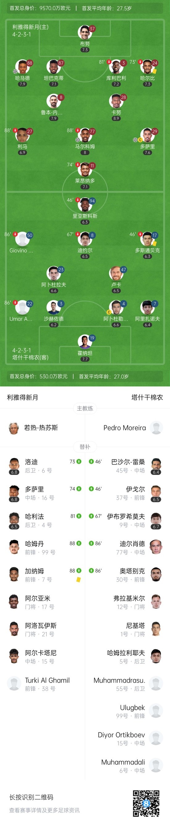 下半场补时5分钟,利雅得新月4-0塔什干棉农。