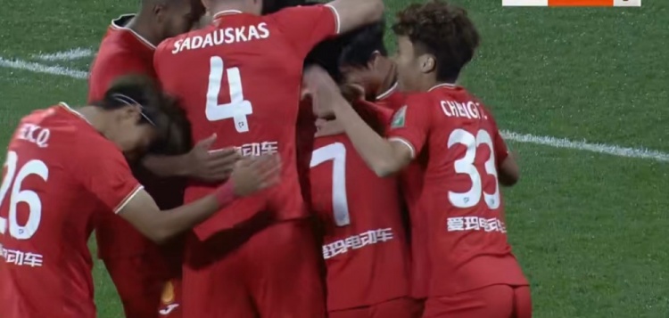 第21分钟,萨达乌斯卡斯右路传中,和晓强头球攻门稍稍顶偏。↓