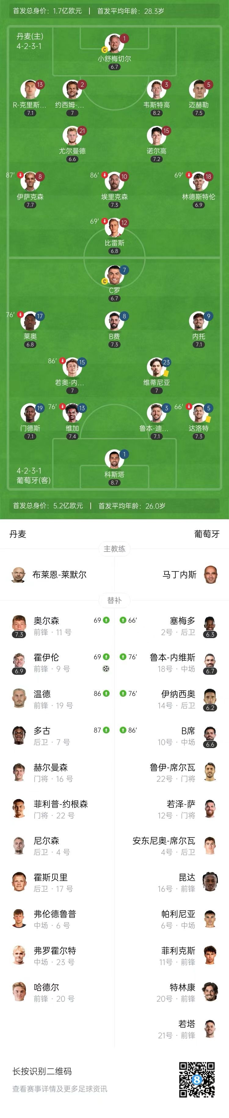 狂轰23脚!丹麦1-0葡萄牙占先机 霍伊伦破门+面对C罗Siu庆祝