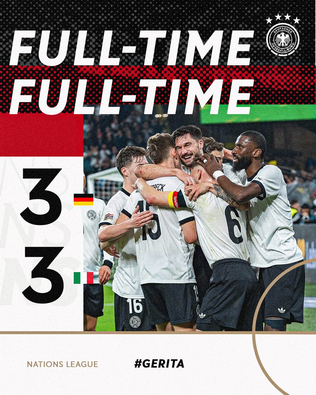 3月24日讯 北京时间3月24日03:45,欧国联八强战次回合德国迎战意大利的比赛在伊杜纳信号公园球场进行,上半场克莱因丁斯特造点,基米希点射首开记录,穆西亚拉推射扩大比分,基米希助攻克莱因丁斯特头球再下一城,下半场基米希失误小基恩抢断破门扳回一城,随后小基恩兜射破门再扳一城,拉斯帕多里补时点射,最终德国3-3总比分5-4意大利晋级四强。