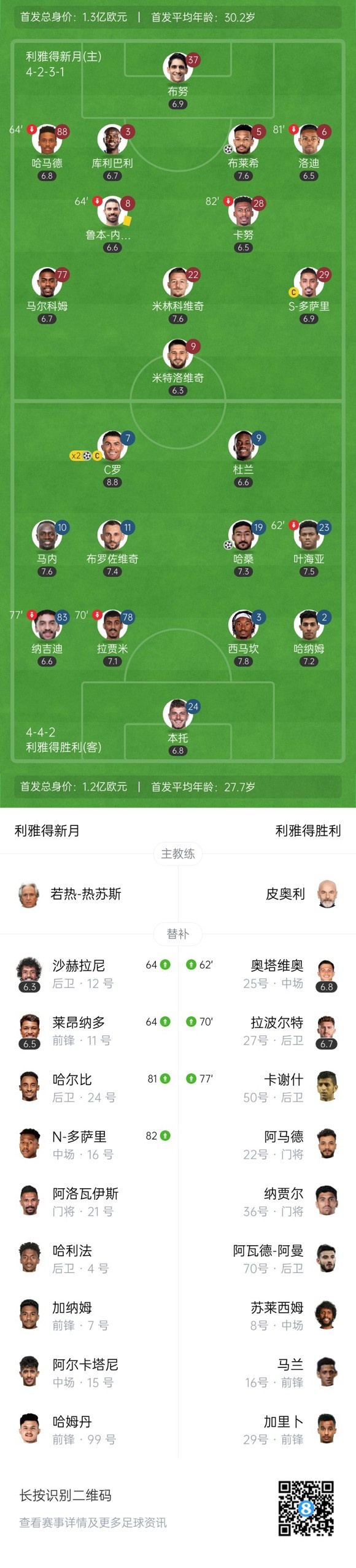 第82分钟,胜利获得点球!杜兰前场接长传球到禁区被哈尔比放倒裁判没有表示,随后经var回放哈尔比手球犯规判罚点球,C罗主罚点球破门,利雅得新月1-3利雅得胜利。↓