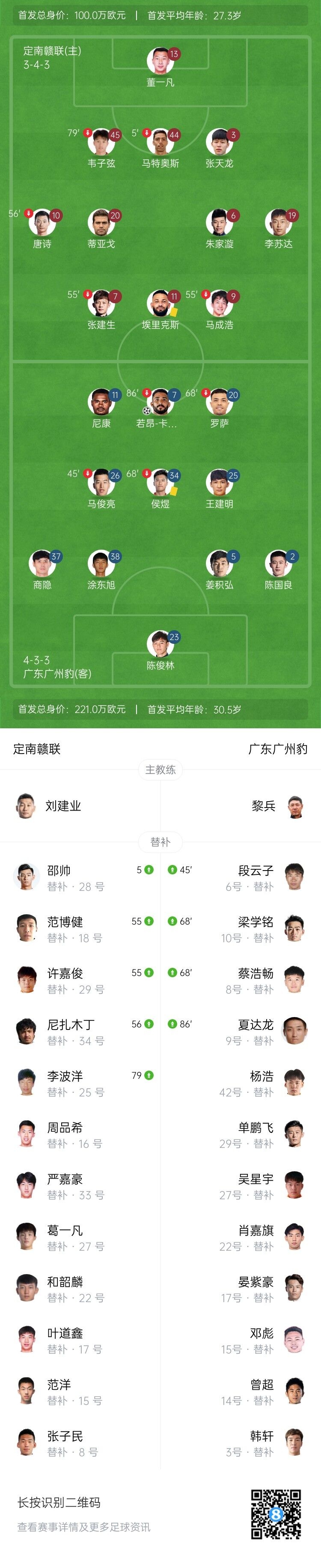 4月5日讯 北京时间4月5日下午15:00,中甲第3轮,定南赣联坐镇定南青少年足球训练中心迎战广州豹。上半场,马特奥斯5分钟伤退,若昂-卡洛斯低射破门,埃里克斯、罗萨中框。下半场,李波洋89分钟扳平。全场结束,定南赣联1-1广州豹。本场过后,广州豹2胜1平积7分排名榜首,定南赣联2平1负积2分排名第13位。