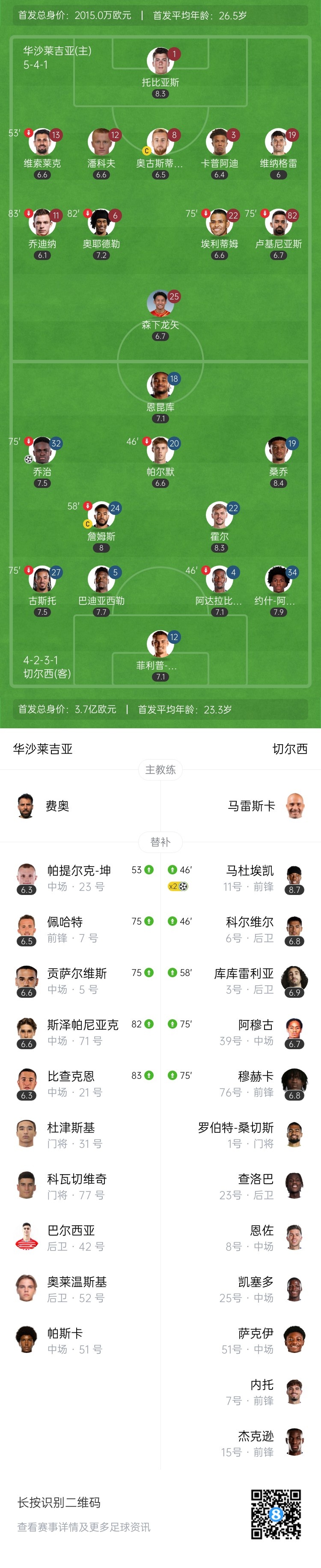 第49分钟,切尔西打破僵局!里斯-詹姆斯禁区前沿凌空抽射被门将扑出,乔治补射破门!切尔西1-0领先华沙莱吉亚↓