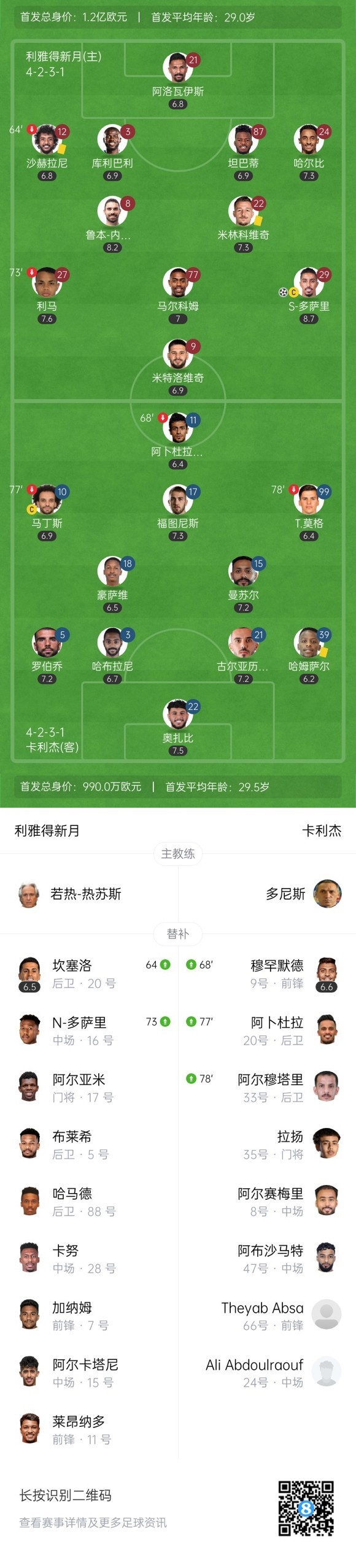 下半场补时5分钟,利雅得新月3-0卡利杰。