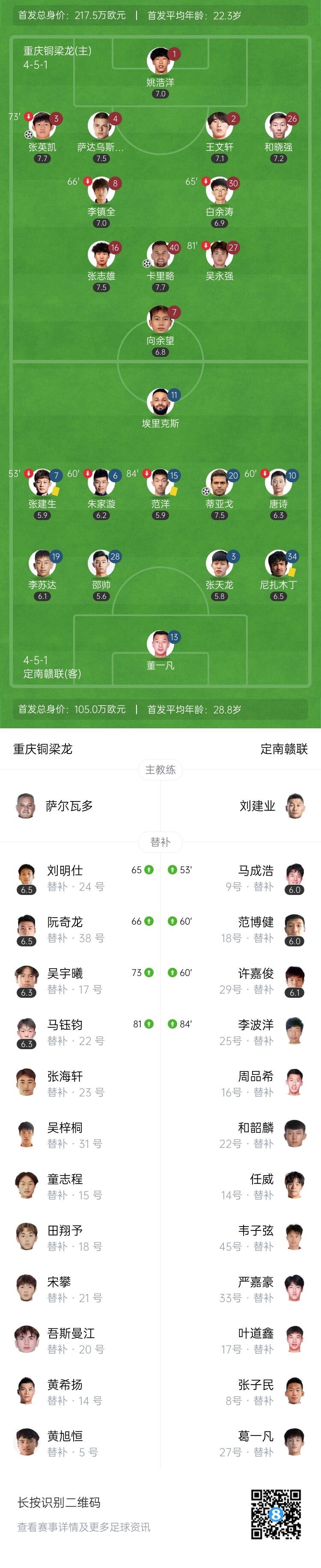 伤停补时6分钟。全场比赛结束,重庆铜梁龙2-1定南赣联。