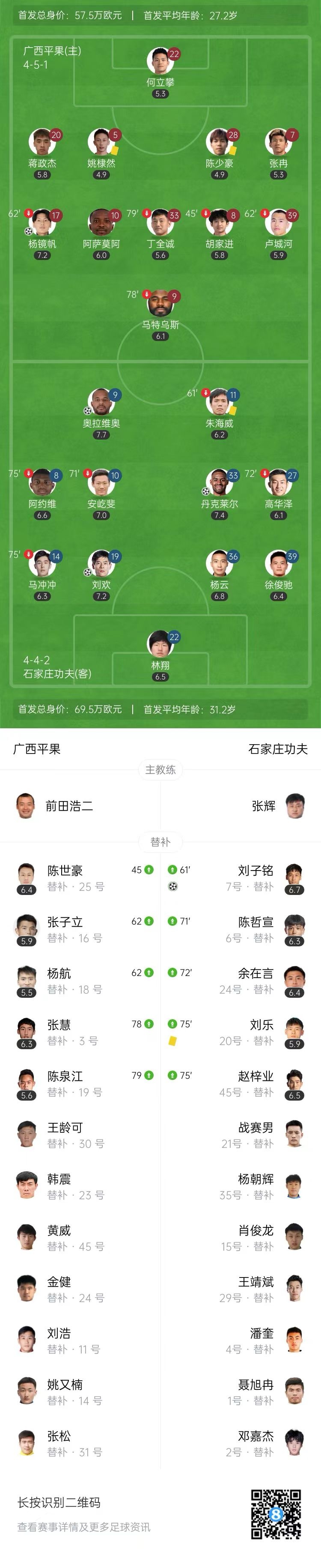 第74分钟,余在言左路倒三角传中到禁区,刘子铭推射打入死角,石家庄功夫4-1!↓