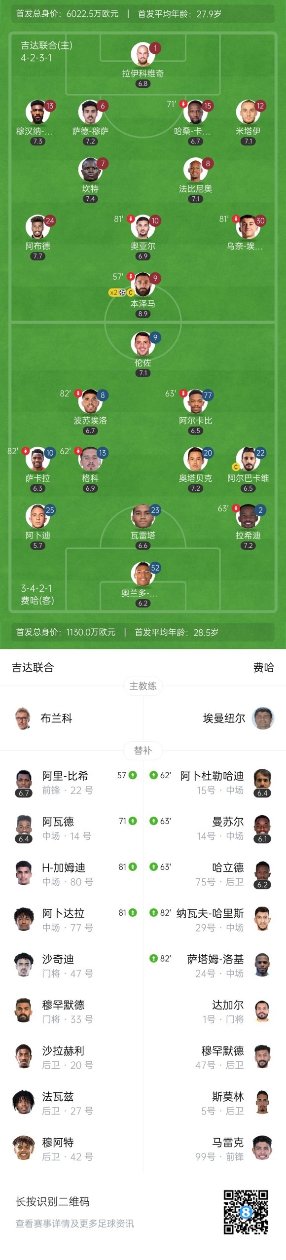 第74分钟,吉达联合扩大比分!尚基提右路下底横传门前阿尔巴卡维解围自摆乌龙,吉达联合3-0费哈。↓