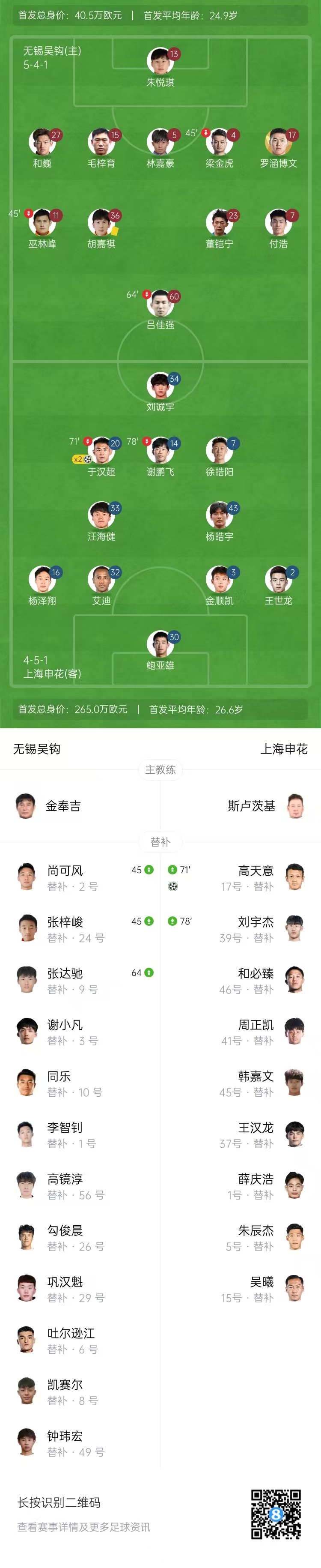第24分钟,徐皓阳中场送出直塞,于汉超晃过门将推空门得手,上海申花2-0无锡吴钩。↓