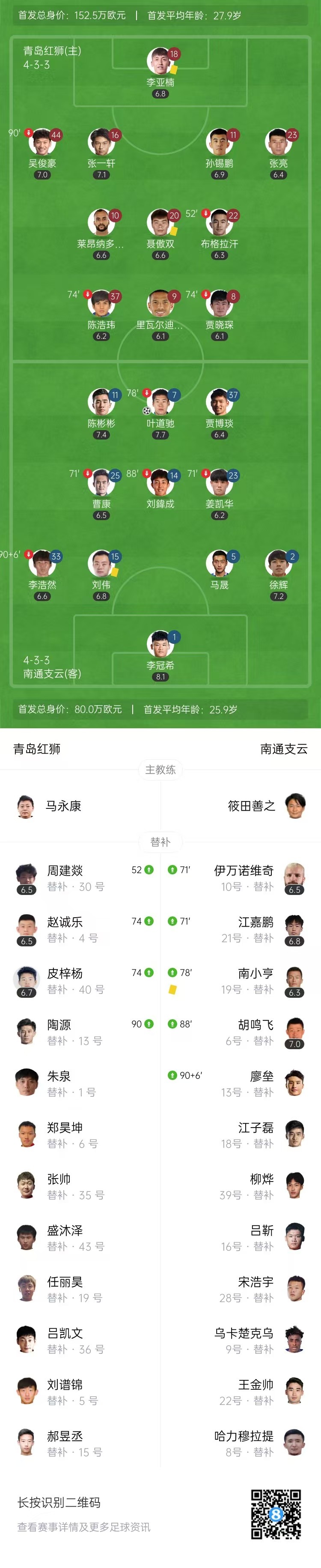 中甲-南通支云1-0青岛红狮 叶道驰破门制胜小里瓦尔多失良机