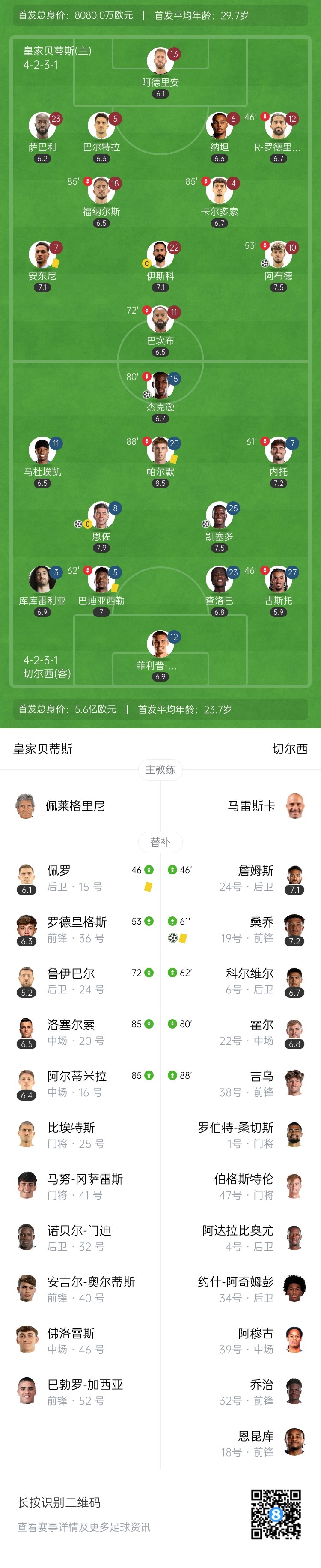 下半场补时5分钟。最终全场比赛结束,贝蒂斯1-4切尔西。