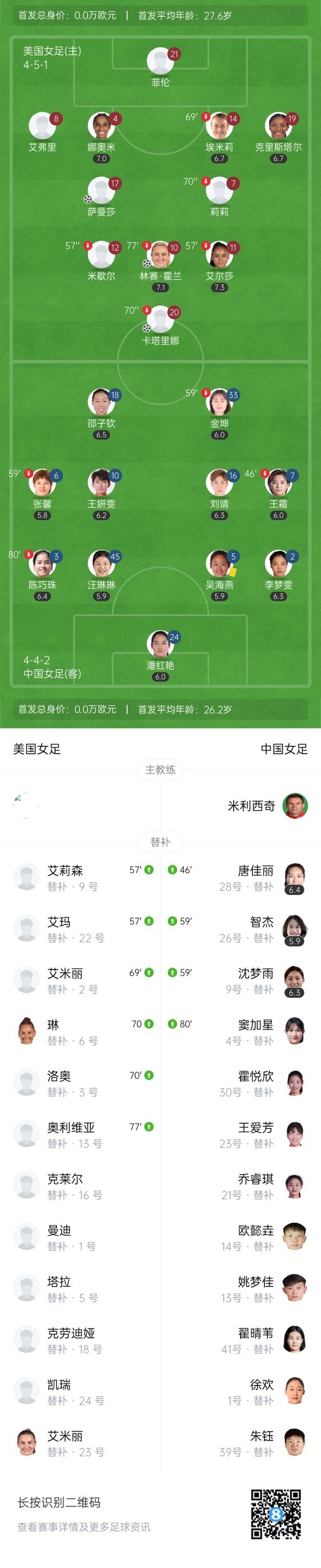 第11分钟,美国反击机会,米歇尔右路下底横传禁区后点被李梦雯关键解围。↓