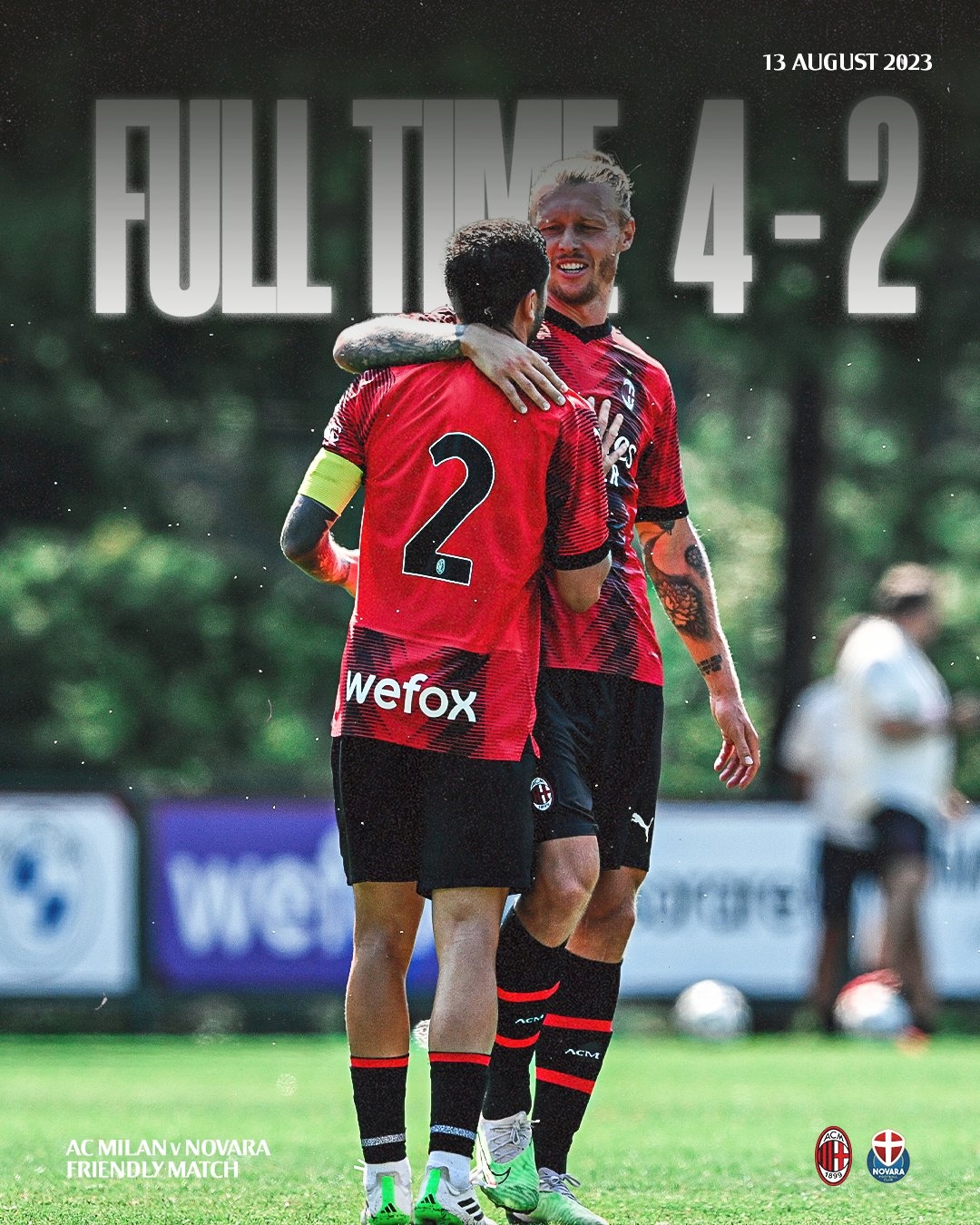 8月13日讯 北京时间今天16:30,友谊赛AC米兰对阵意丙球队诺瓦拉。上半场丘库埃泽、奥卡福破门,科尔蒂为诺瓦拉扳回一球,米兰2-1领先。下半场卡拉布里亚远射入网,普里内利再扳一城,科隆博凌空抽射锁定胜局,最终米兰4-2取胜。