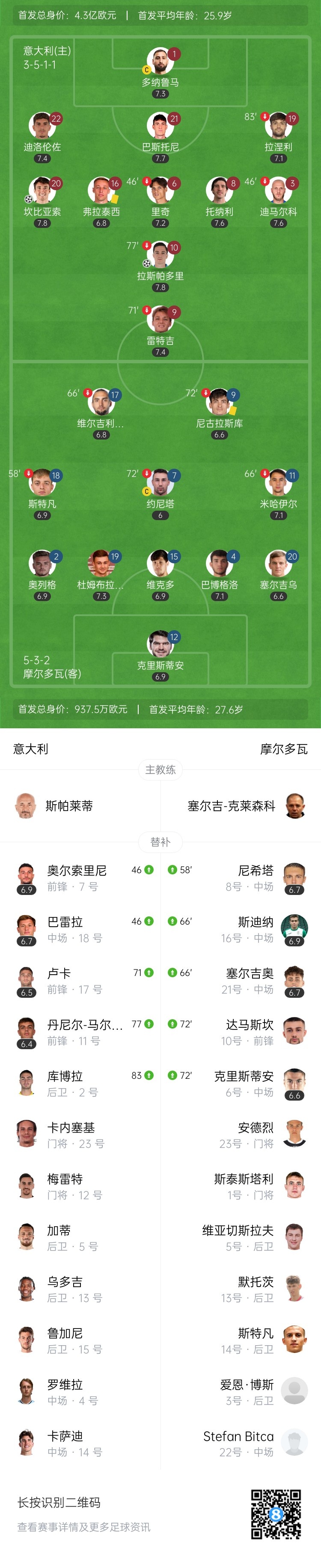 6月10日讯 北京时间2:45,世预赛欧洲区小组赛I组第4轮意大利vs摩尔多瓦,比赛在马贝体育场打响!上半场,尼古拉斯库破门被吹,意大利逃过一劫;拉涅利头球击中横梁;拉斯帕多里凌空破门打破僵局!下半场,坎比亚索再下一城。最终,意大利2-0击败摩尔多瓦,取得世预赛首胜,送别斯帕莱蒂!