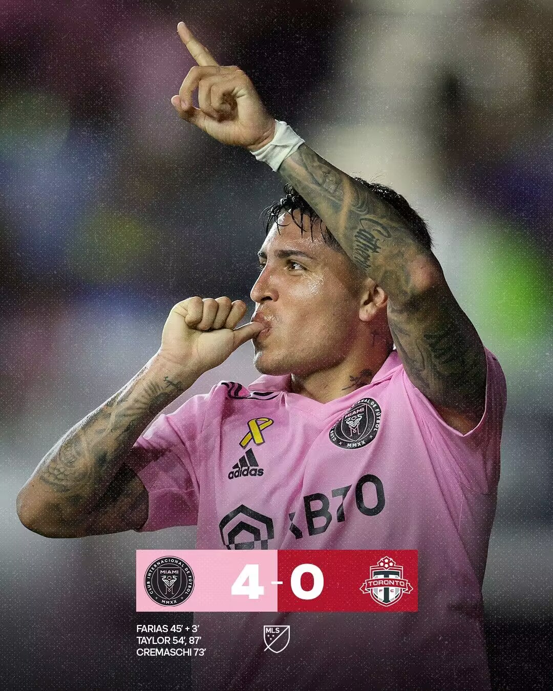 第87分钟,迈阿密国际杀死比赛!法里亚斯挑传禁区右路泰勒停球后小角度爆射破门,迈阿密国际4-0多伦多FC。↓